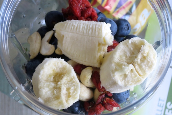 Fill the cup with ingredients no higher than the maximum capacity indicated. The instructions recommend 50% leafy greens, 50% other vegetables or fruit, and add water to the maximum fill line.